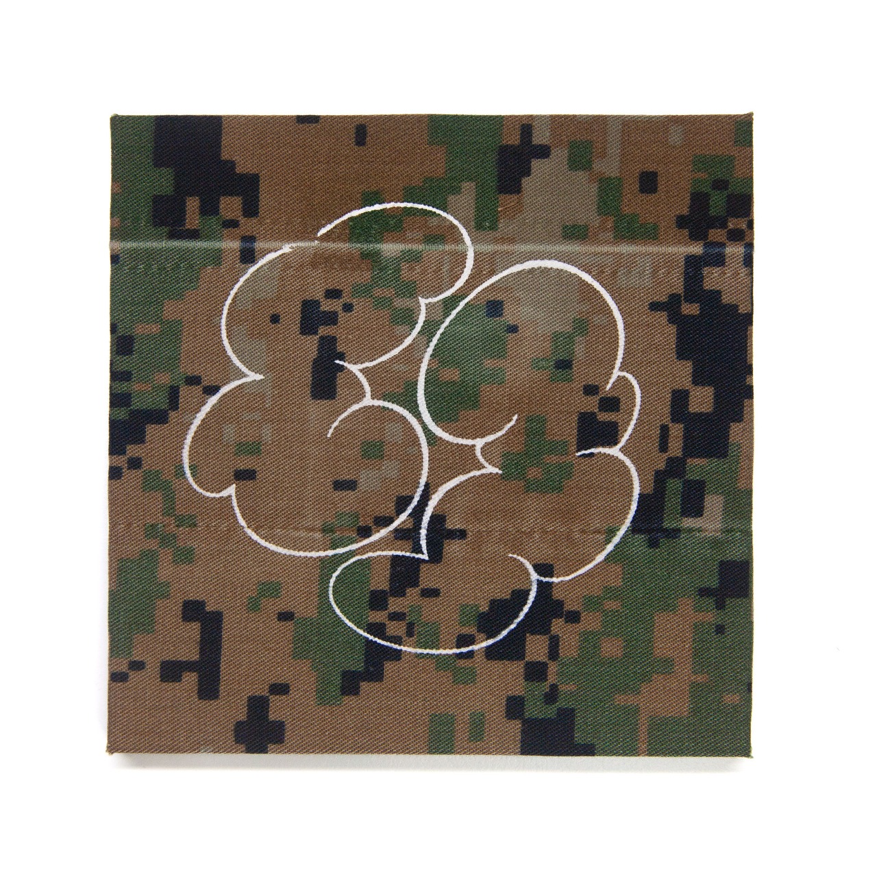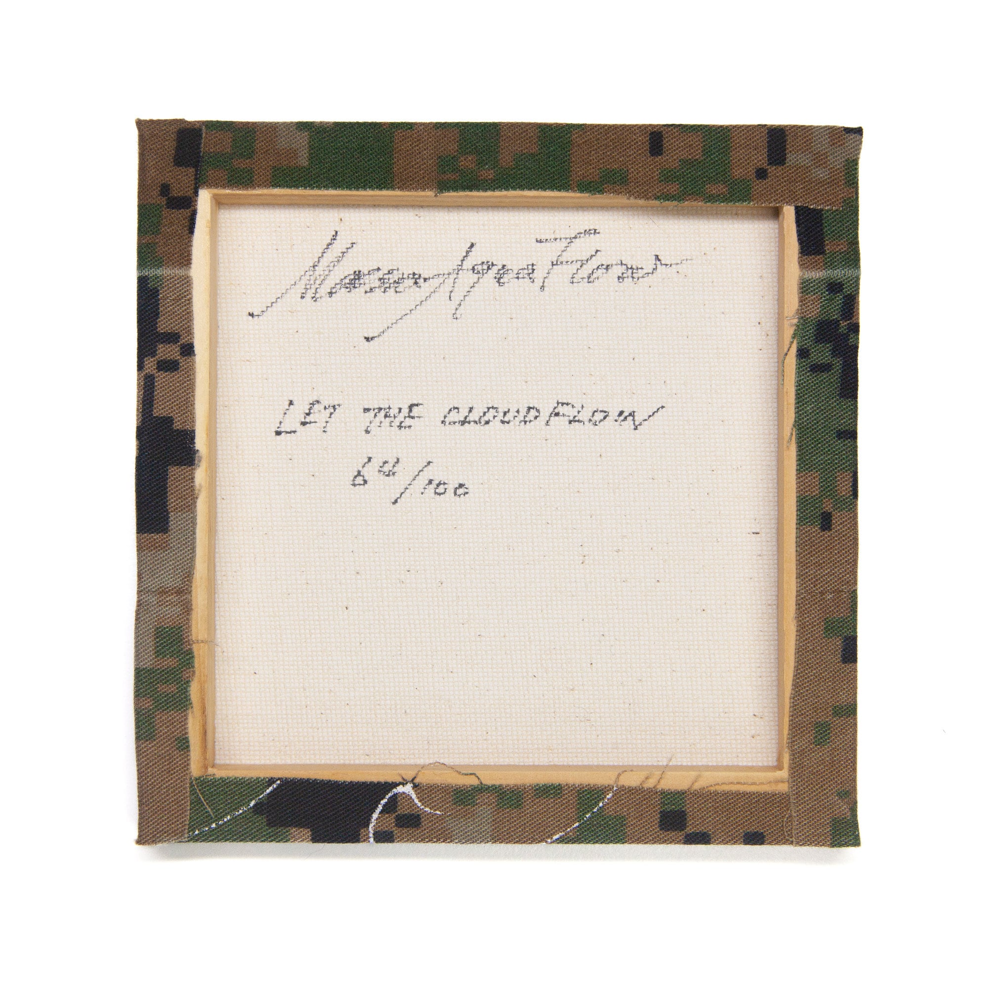 迷彩柄と雲の組み合わせが全て違う、1点ものとなっています。迷彩柄へどのように雲をプリントし、どのようにトリミングするか、そういった過程において作家自身で判断し、ハンドプリントで制作しています。