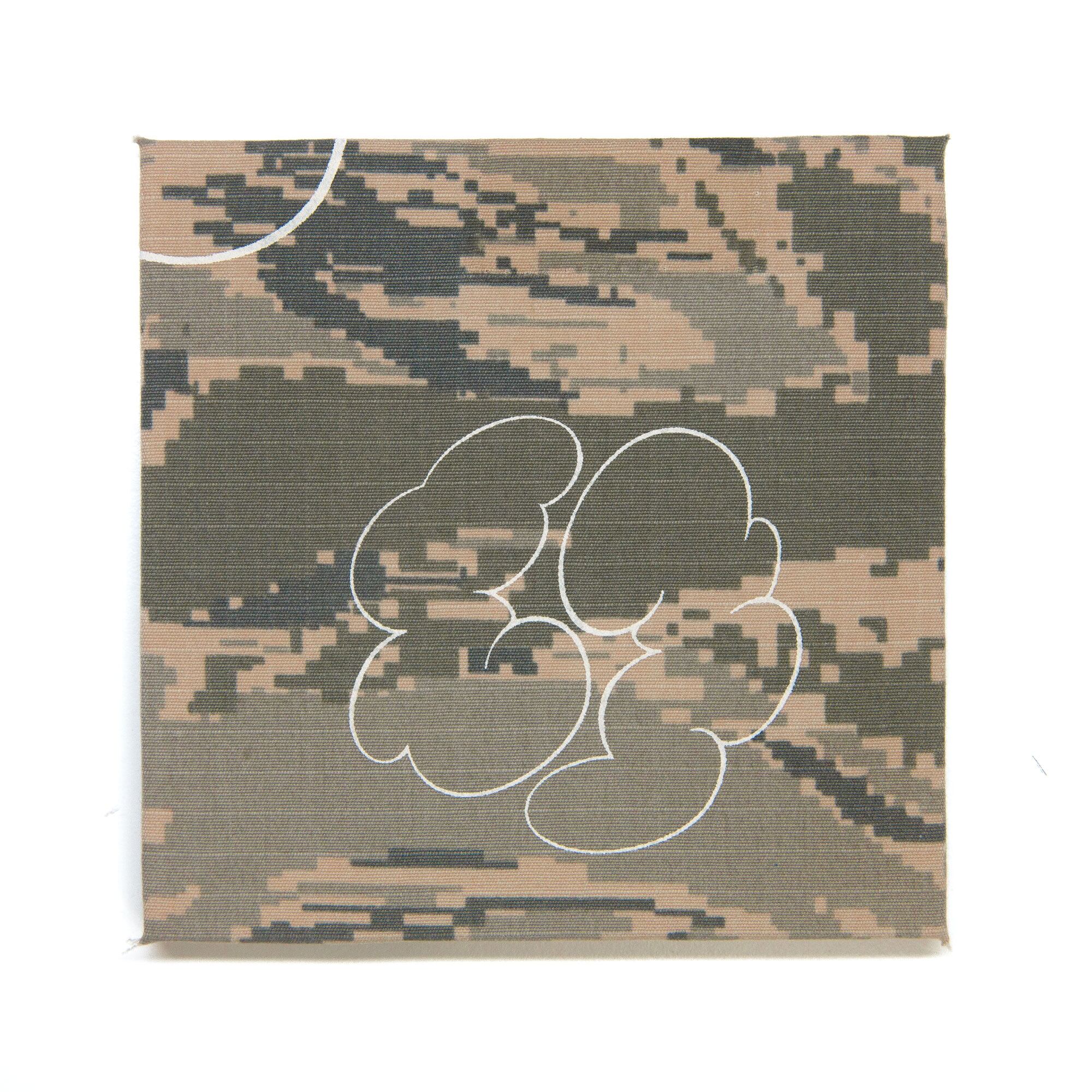 迷彩柄と雲の組み合わせが全て違う、1点ものとなっています。迷彩柄へどのように雲をプリントし、どのようにトリミングするか、そういった過程において作家自身で判断し、ハンドプリントで制作しています。