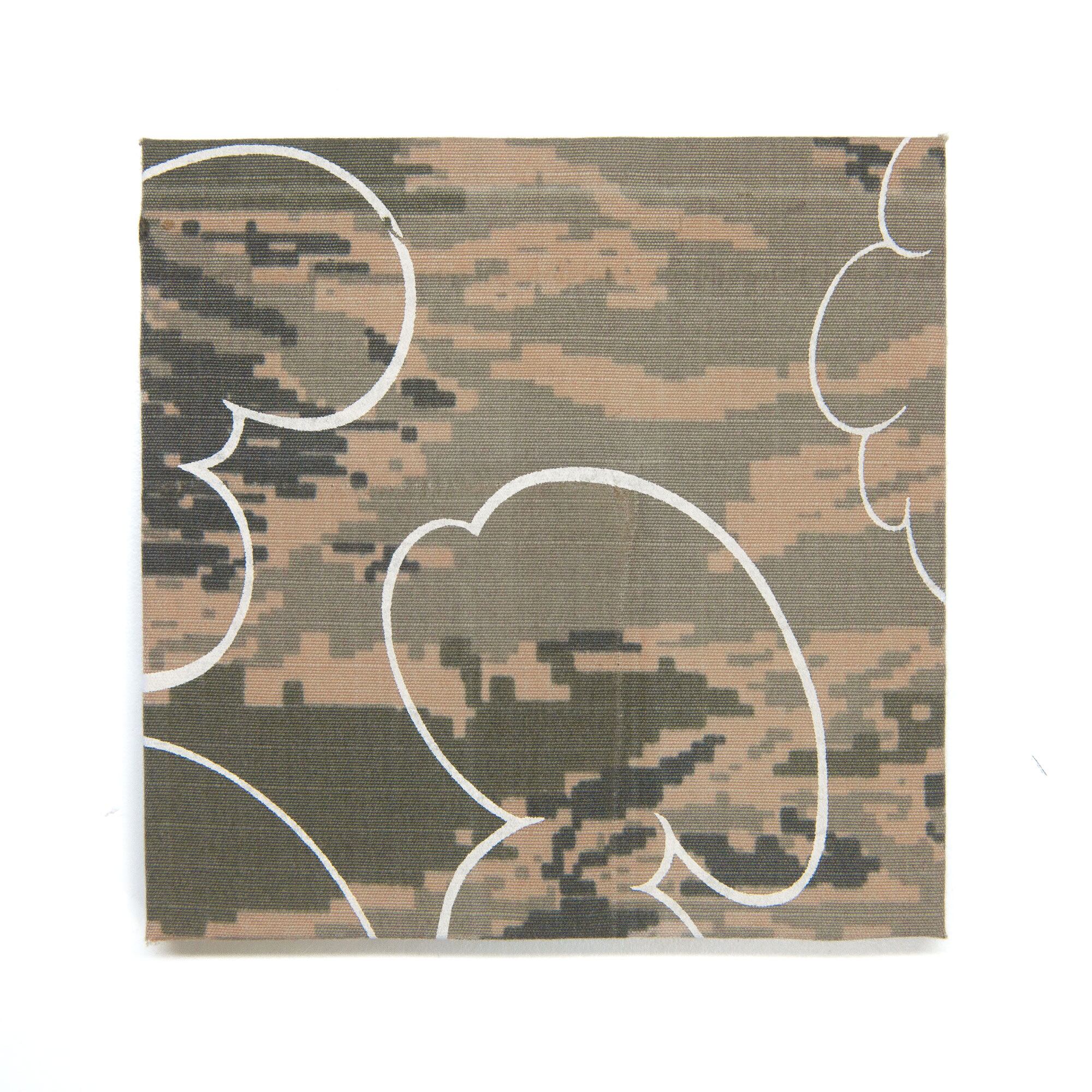 迷彩柄と雲の組み合わせが全て違う、1点ものとなっています。迷彩柄へどのように雲をプリントし、どのようにトリミングするか、そういった過程において作家自身で判断し、ハンドプリントで制作しています。